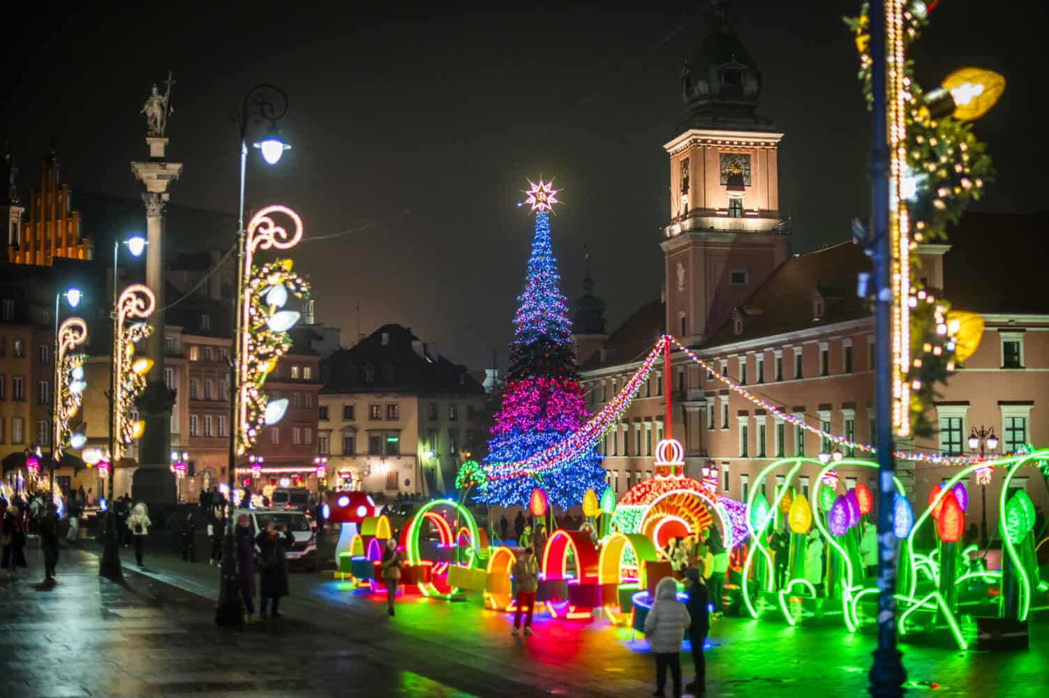 A 27-meter Christmas tree, the largest in Warsaw (and in Poland), is lit on Castle Square (Plac Zamkowy) in Warsaw’s Old Town. The main attractions on Warsaw streets are focused on “The Royal Route”, from the Castle Square/Plac Zamkowy (including the Christmas tree), Krakowskie Przedmieście Street, Nowy Świat Street to the de Gaulle roundabout (Rondo de Gaulle’a). The Old Town is also decorated (including Piwna Street, Świętojańska Street, Old Town Square, Nowomiejska Street, Freta Street, New Town Square, Kościelna Street, to Podzamcze).